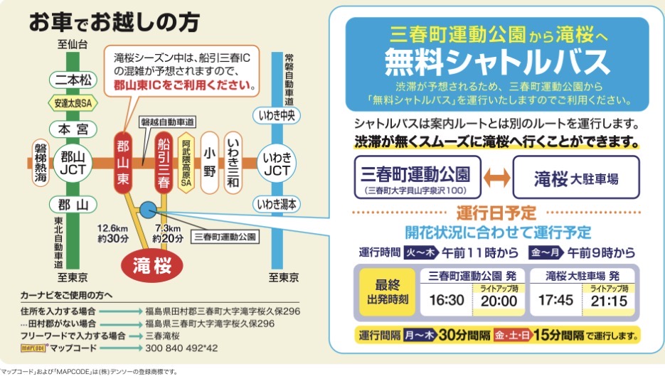 ・三春町運動公園と滝桜大駐車場を往復する無料シャトルバスも運行しますので、お乗り間違えのないようご注意ください。 - お問合せ