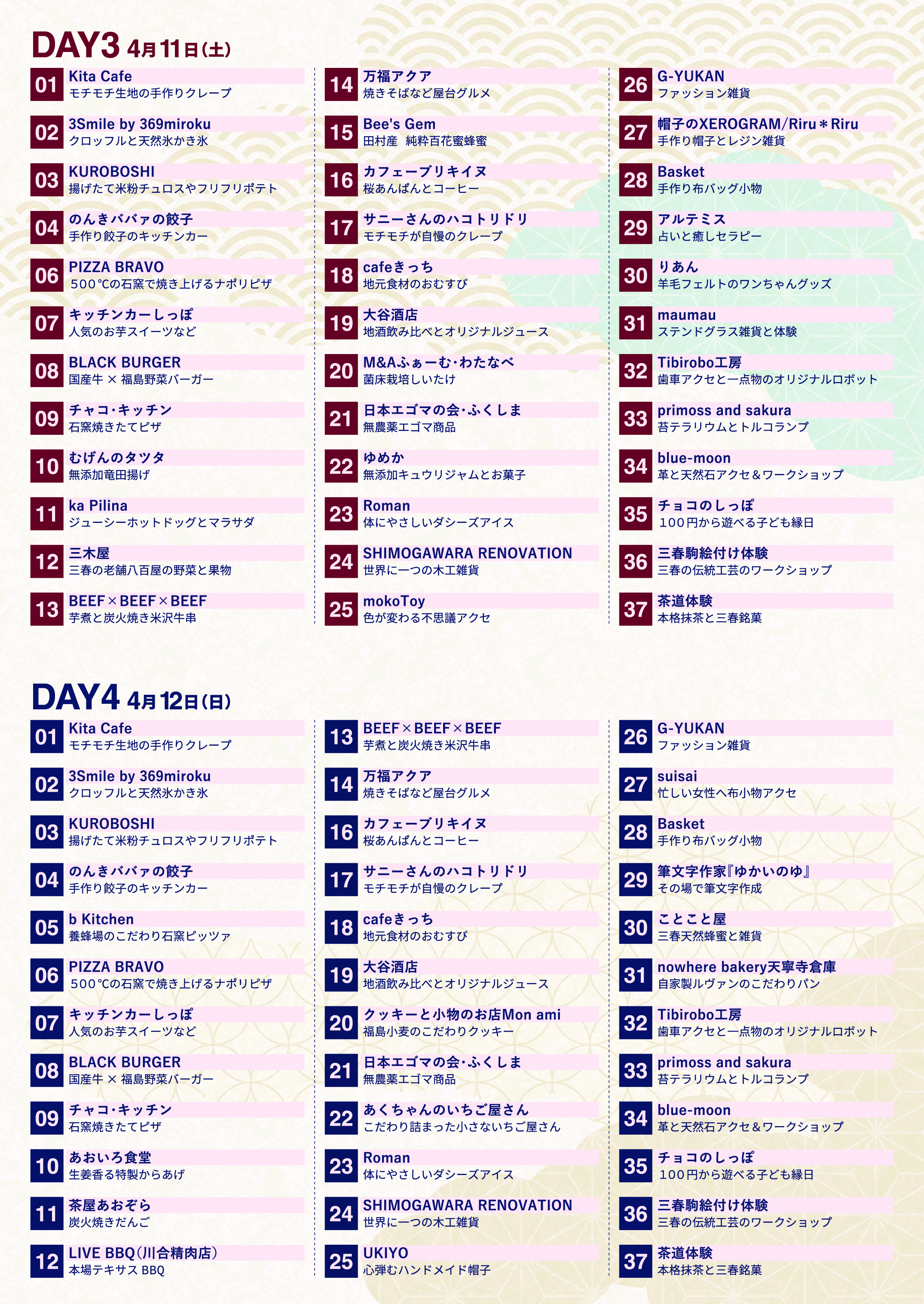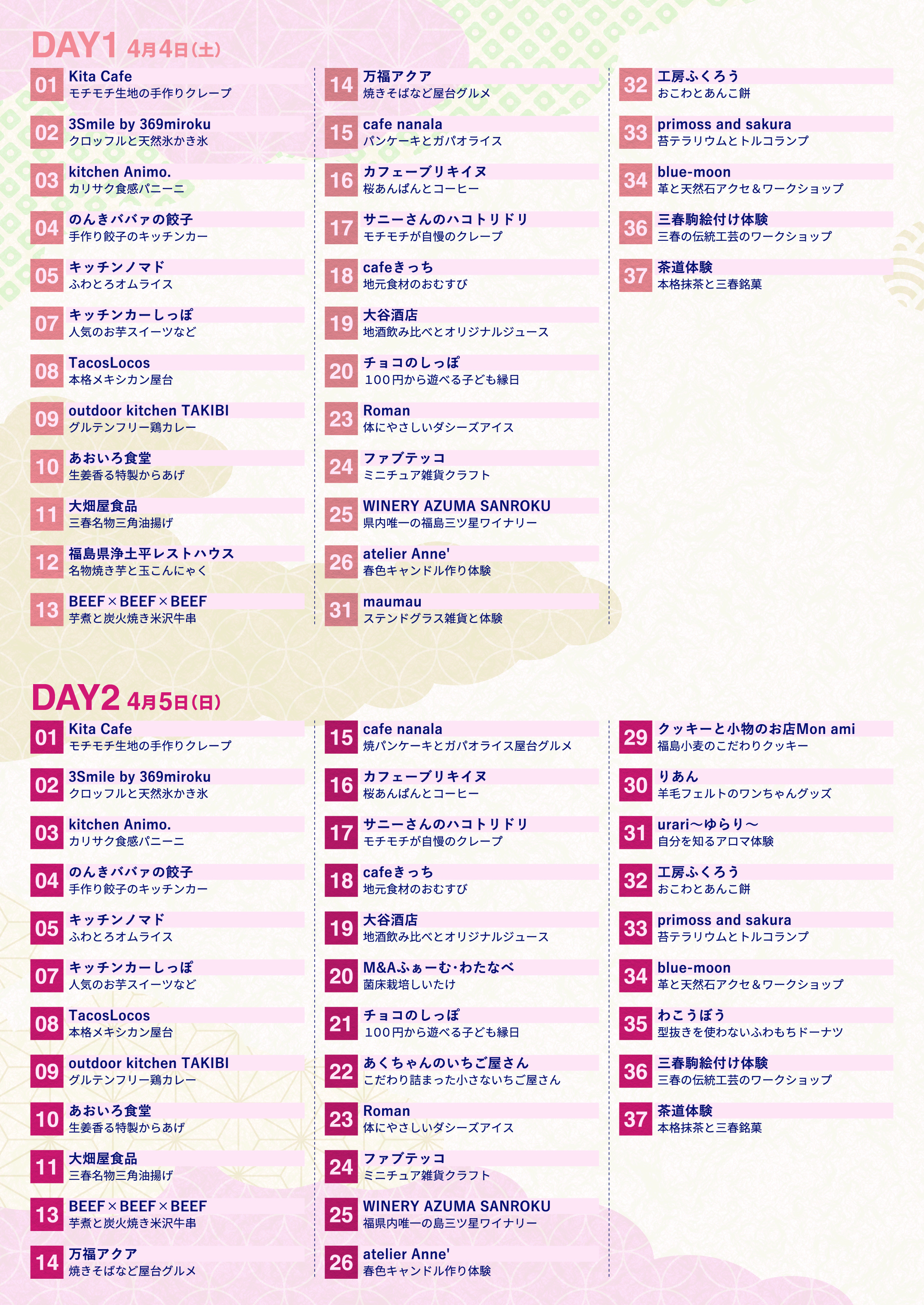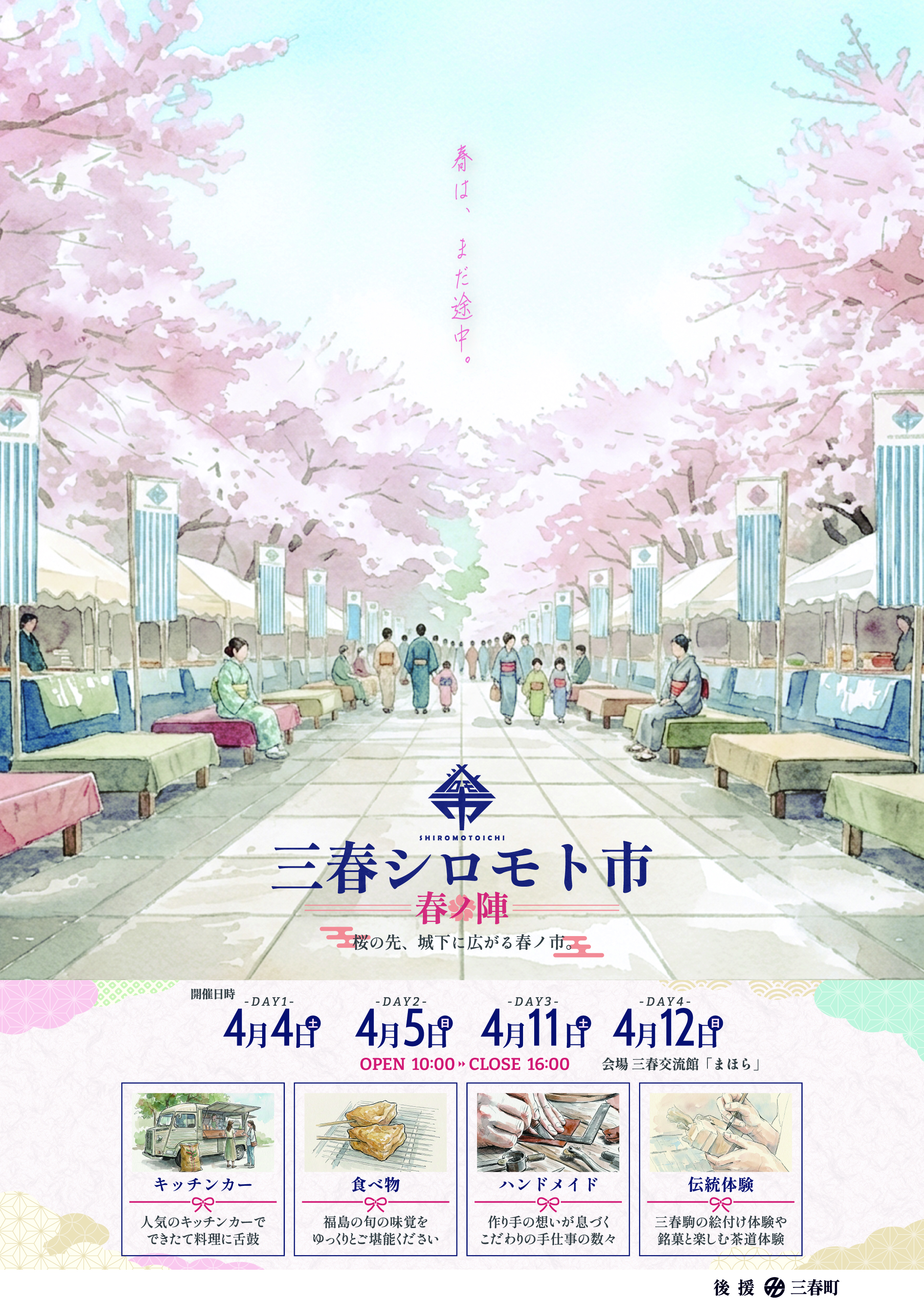 地元有志による「温かい手作り感」と「厳選グルメ」が特徴。地元店舗をはじめ、福島県内各地の人気店の限定メニュー、キッチンカーが集結します。三春駒の絵付け体験、ワークショップ、ハンドメイド作品など盛りだくさん。三春の春は滝桜が主役ですが、「見る」観光から「食べる・買う・体験する」観光へと楽しみが広がります。